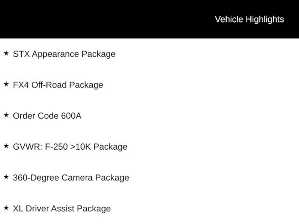 The F-250SD XL is built to conquer any terrain, thanks to the FX4 Off-Road Package that includes Hill Descent Control and skid plates. The STX Appearance Package adds a touch of style with body-color bumpers, LED lighting, and a unique box decal. Inside, you'll find a spacious and comfortable cabin with premium features like the SYNC 4 infotainment system and a 360-degree camera for enhanced visibility.